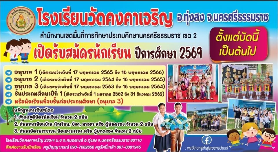 โรงเรียนวัดคงคาเจริญ..เปิดรับสมัครนักเรียนใหม่ประจำปีการศึกษา..2569..ณ.บัดนี้...เริ่มรับเด็กอายุครบ..3..ปี..(เกิดก่อนวันที่.16.พฤษภาคม.2566)...สามารถโทรประสาน/สอบถาม...ได้ที่เบอร์...0818954925